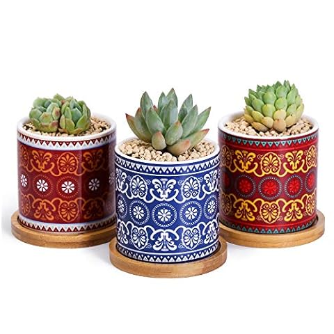 Greenaholics Succulent Pots – 3 Inch Morocco Pattern Cylinder Ceramic Planters for Small Succulent, with Bamboo Saucers, Set of 3