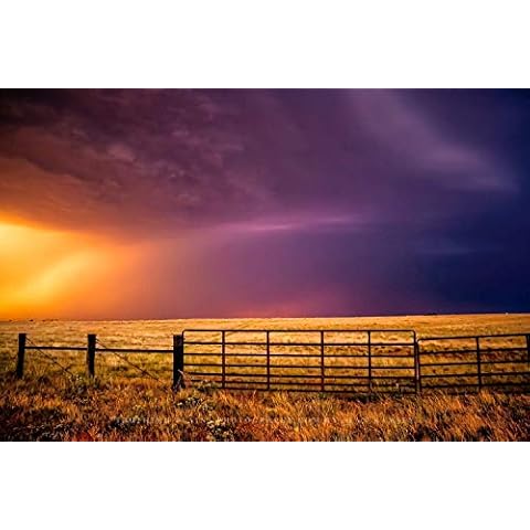 Storm Photography Print (Not Framed) Picture of Colorful Stormy Sky Over Fence Gate on Summer Evening in Oklahoma Thunderstorm Wall Art Western Decor (4″ x 6″)