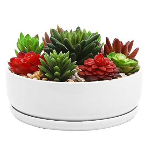 MyGift Cylindrical White Ceramic 8 Inch Plant Pot with Drainage Hole and Removable Tray, Indoor Outdoor Small Succulent Planter