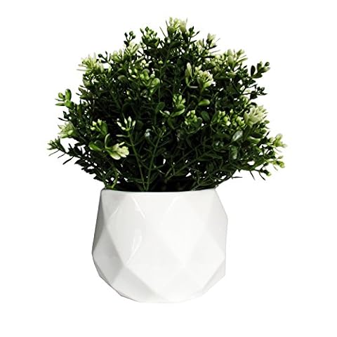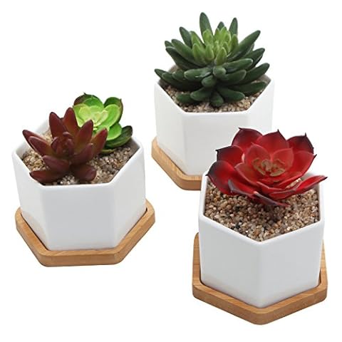 Small Ceramic Hexagonal Succulent Planters, Flower Pots with Bamboo Saucers, Set of 3, White