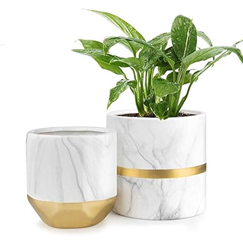 homenote White Ceramic Flower Pot Garden Planters 6/4.8 inch Pack 2 Indoor, Plant Containers with Marble Texture and Gold Detailing
