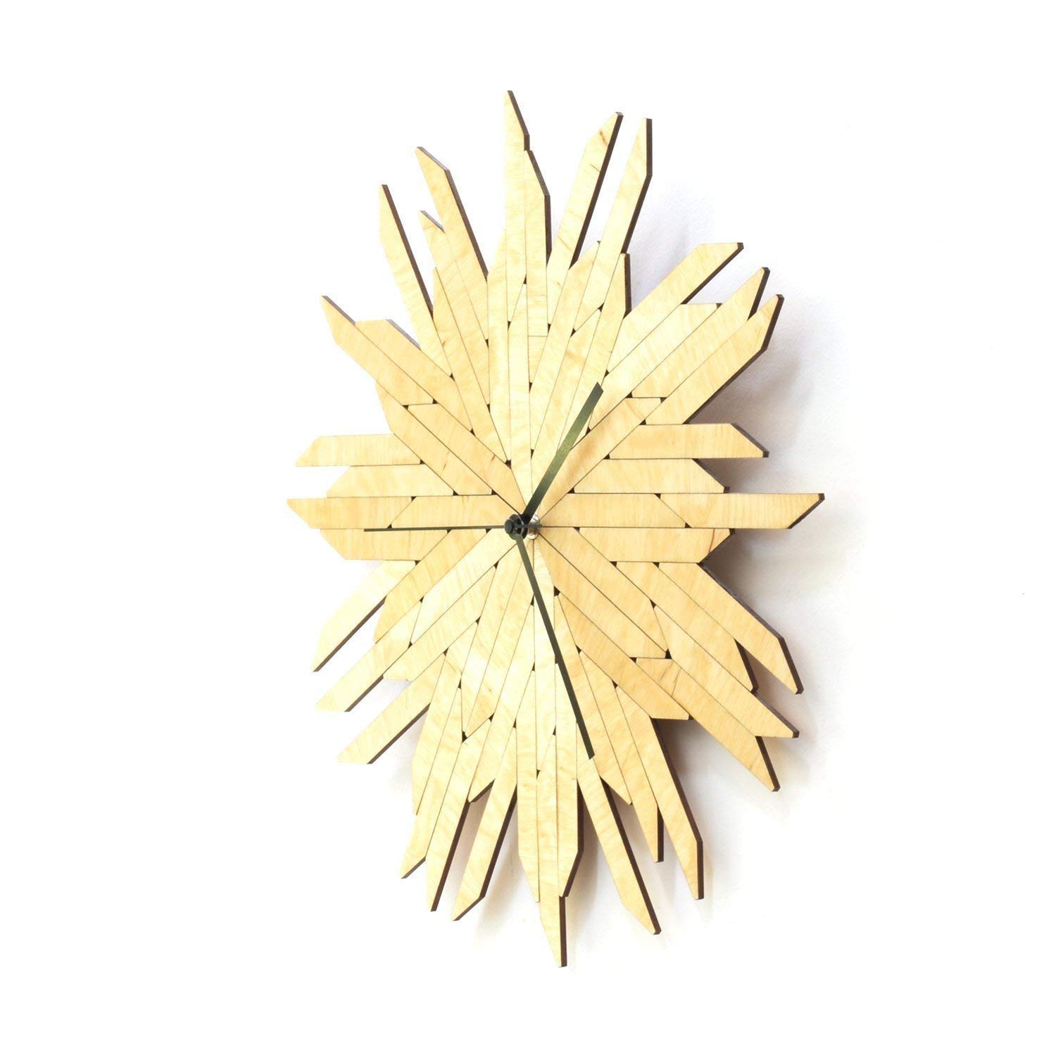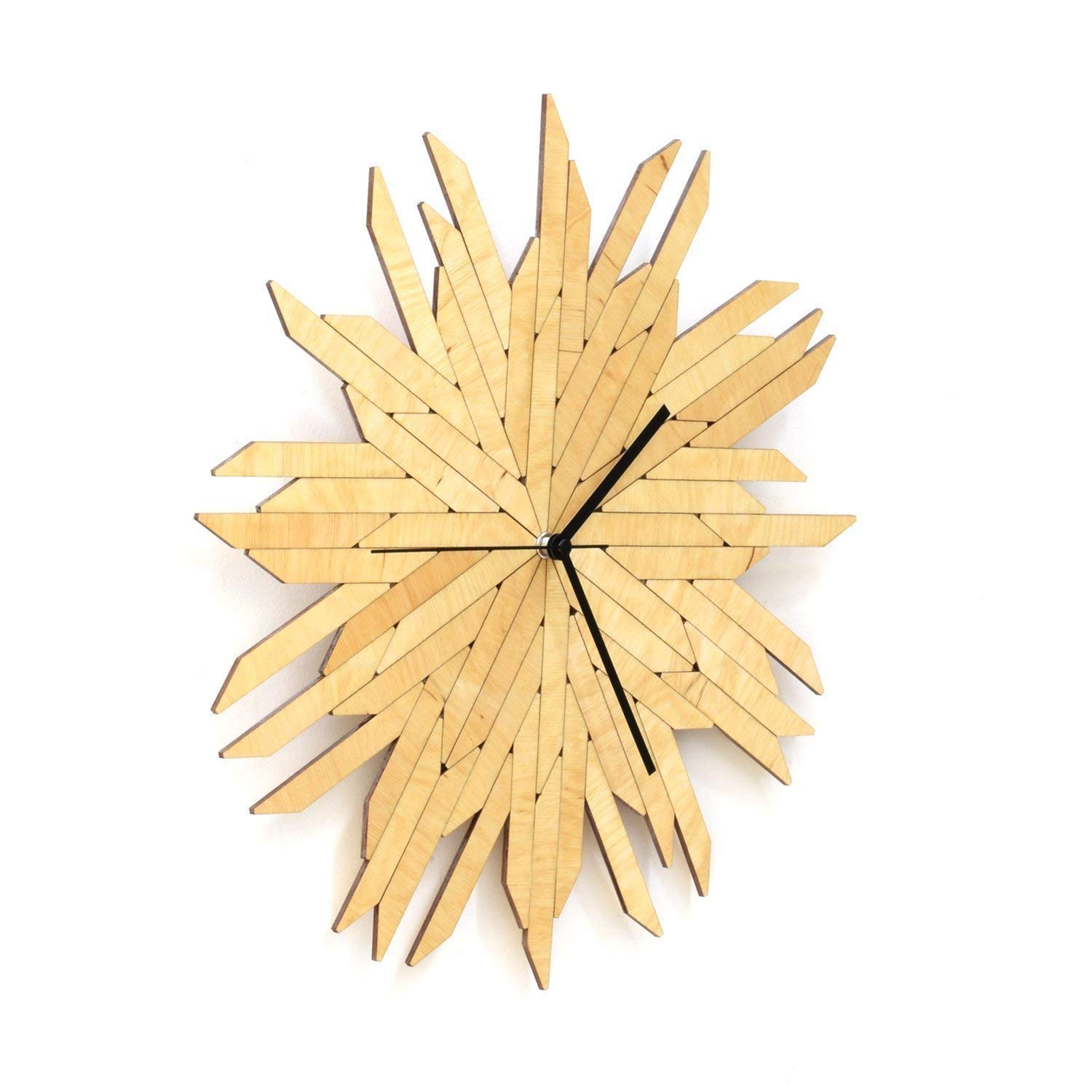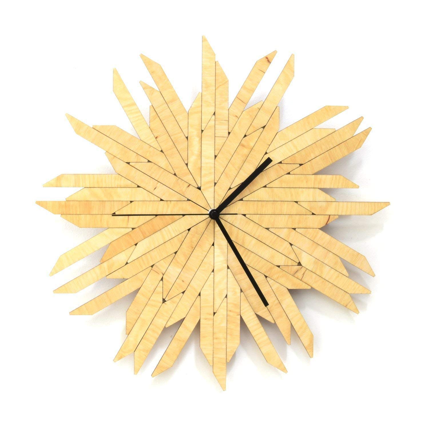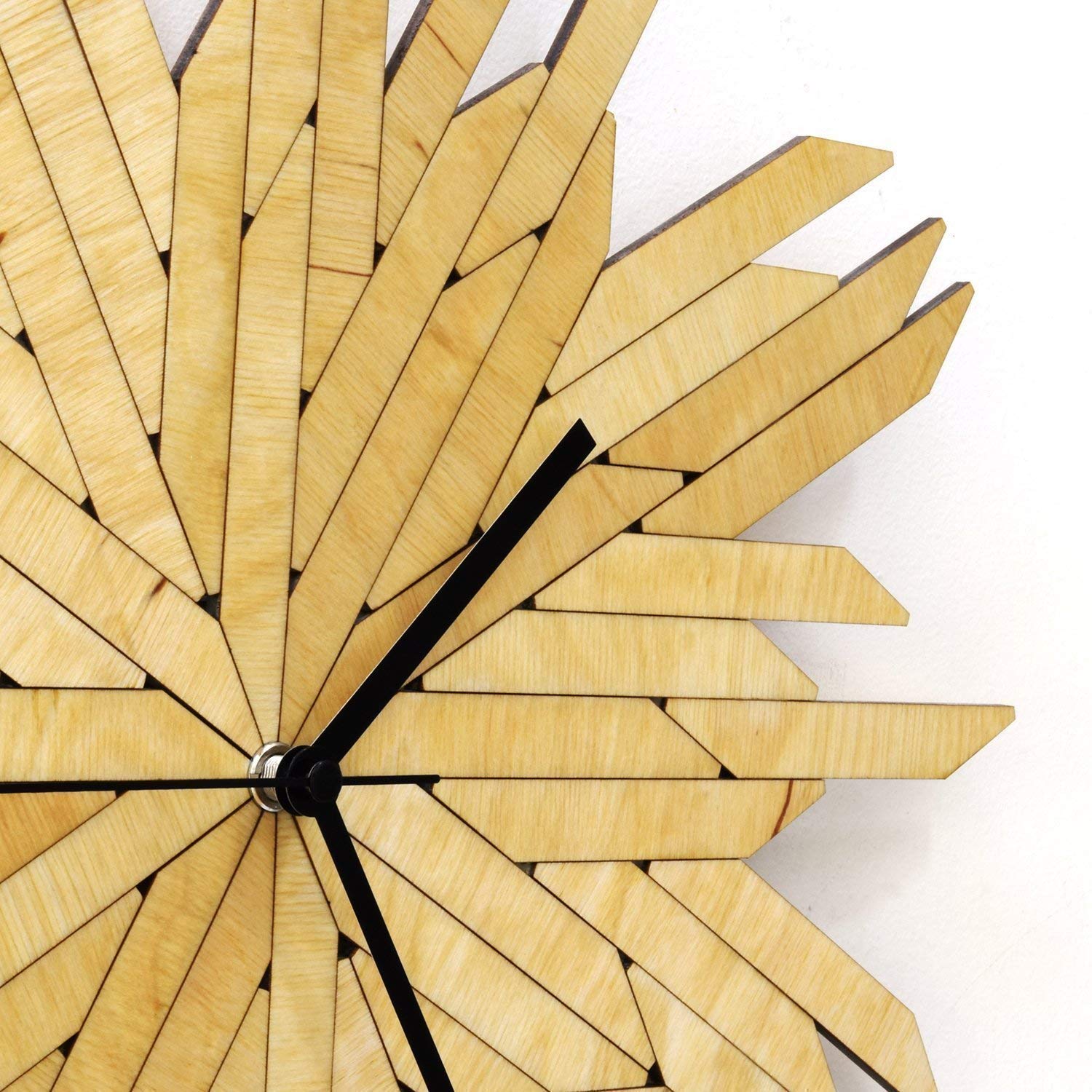 This clock depicts a stylish haystack – uniform elements piled together like a puzzle in a seemingly confusing manner. The 30° cut on the ends of every piece creates the 12 different directions this clock is showing the time with, and these changing directions (also of the wood grains) give the exciting shading effect to the dial: some elements look darker even as others are lighter – alternatively all bear the similar color (see the 2nd and 3rd photos).