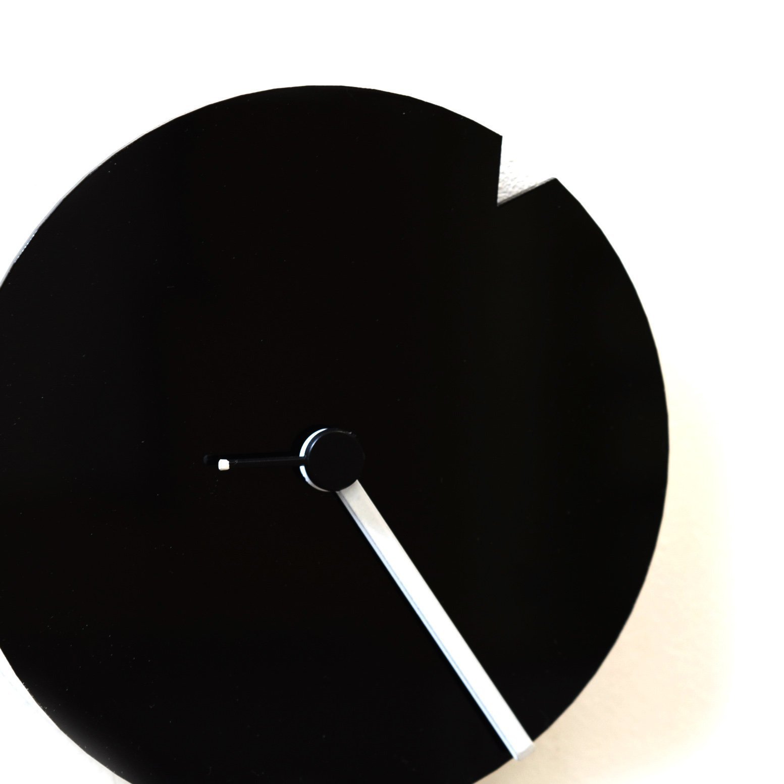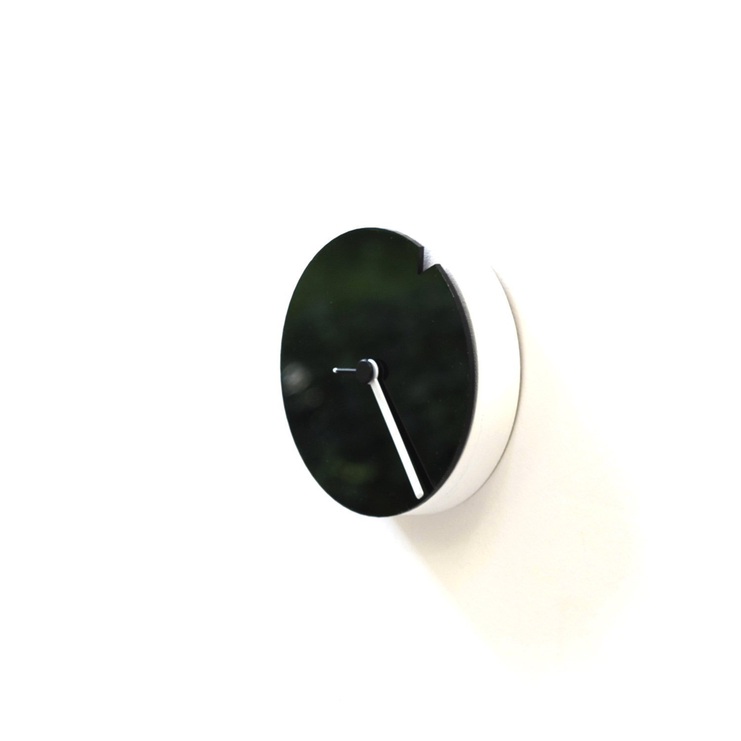 This tiny black clock is the minimalism itself. The black acrylic dial of this clock is the hour hand herself that rotates around slowly whilst appearing the time with that triangular indent at the rim. The minute hand is a typical white rod whilst the second one hand is a brief black pin with a white point on its tip – and is most effective visible whilst seen from nearer distance. The housing of the clock consists of laser cut plywood boards which can be painted white and touches the wall everywhere in the edge, so the movement isn’t visible in any respect.